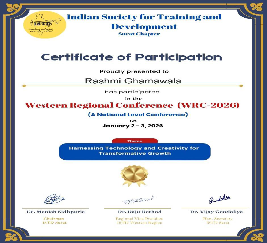 Dr. Rashmi Ghamawala actively participated in the Western Regional Conference (WRC– 2026) organized by the Indian Society for Training & Development (ISTD), Surat Chapter on 2nd and 3rd January 2026 at AURO University, Earthspace, Hazira Road, Surat. The conference was conducted on the theme “Harnessing Technology and Creativity for Transformative Growth.” The event brought together HR professionals, trainers, academicians, and industry leaders from across the western region to discuss the evolving role of technology, creativity, and innovation in learning and organizational development. The conference served as a platform for sharing best practices, exploring new ideas, and strengthening professional networks.