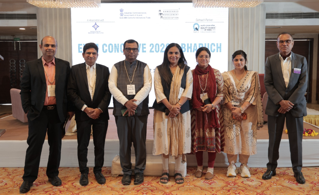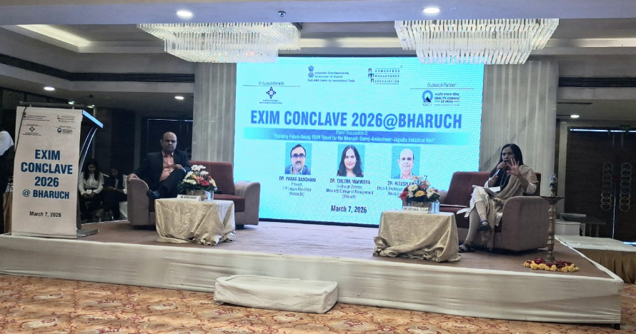 Dr./Prof. Chetna Makwana, Faculty & I/C Director of NCM served as a distinguished panellist at the EXIM Conclave 2026 in Bharuch, organized by the Ahmedabad Management Association (AMA) in association with the Government of Gujarat (GoG). She contributed to discussions on building future-ready EXIM talent for the Bharuch–Dahej–Ankleshwar–Jagadia industrial belt, emphasizing the role of academia in preparing the next generation for global trade competitiveness. Objective of the conclave was to integrate infrastructure, compliance, and talent development into a cohesive strategy for regional and global trade growth.